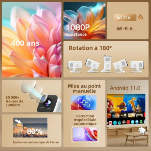 Mini projecteur avec Wifi6 et BT5.4 1080P 4K prenant en charge Android 11 Auto Keystone 180 °
