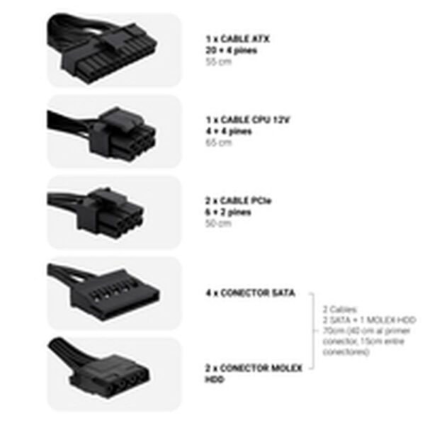 La CoolBox COO-FAPW3-650 est une alimentation essentielle pour les systèmes de bureau nécessitant stabilité et efficacité énergétique. Conçue selon la norme ATX 12V v2.31 d’Intel, cette alimentation offre une puissance nominale de 650 W capable de supporter des configurations moyennes et avancées avec fiabilité. Son design au format ATX comprend un châssis noir et des câbles plats favorisant une meilleure gestion de l’espace et une circulation optimale de l’air à l’intérieur, aidant à maintenir des températures basses lors d’utilisations prolongées. Ce modèle se distingue par une efficacité énergétique de 85 % à 50 % de charge et un rendement supérieur à 80 % en pleine charge, grâce à la technologie de conversion DC-DC, réduisant la consommation électrique et assurant une stabilité des tensions fournies. Il est équipé d’un ventilateur silencieux de 120 mm à vitesse régulée par température, garantissant un équilibre entre refroidissement et faible bruit. Côté connectivité, il dispose d’un ensemble complet de connecteurs incluant 1 connecteur principal ATX 20+4 broches, 1 connecteur 12V 8 broches (4+4), 2 connecteurs PCI Express 6+2 broches, 4 connecteurs d’alimentation SATA et 2 connecteurs Molex pour HDD, facilitant son intégration dans diverses configurations matérielles nécessitant de multiples options pour disques durs, lecteurs optiques ou cartes graphiques. L’alimentation intègre des protections électroniques avancées contre les surcharges (OPP), surtensions (OVP), sous-tensions (UVP) et courts-circuits (SCP), ainsi qu’un facteur de puissance actif supérieur à 0,9, réduisant les pertes et améliorant la qualité de l’énergie fournie. Parmi ses autres caractéristiques techniques figurent une plage de température de fonctionnement de 0 à 50 ºC, une humidité relative de 20 % à 90 % sans condensation, un temps de latence supérieur à 16 ms et un signal Power Good entre 100 et 500 ms, garantissant une synchronisation correcte avec la carte mère. Ses dimensions compactes de 150 x 140 x 86 mm et un poids de 1,225 kg en font une option polyvalente pour la plupart des boîtiers standards. La CoolBox COO-FAPW3-650 est une solution fiable et équilibrée pour les utilisateurs recherchant une alimentation ATX performante, efficace et dotée de multiples connecteurs assurant la compatibilité avec des composants modernes dans des configurations PC milieu de gamme.
