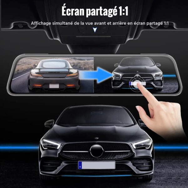 1:1 conception d’écran divisé pour basculer l’enregistrement avant et arrière, grand écran et clairement et facilement vérifier la vue arrière. Écran tactile pour passer à la caméra avant, caméra arrière.