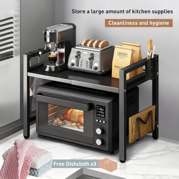 Conception extensible La longueur et la hauteur du support de four à micro-ondes pour la cuisine peuvent être étendues, la longueur varie de 40 à 64 cm et la hauteur de l’étagère est de 32 ou 40 cm, librement réglable en fonction de la taille pour répondre à vos besoins et économiser de l’espace pour votre cuisine.