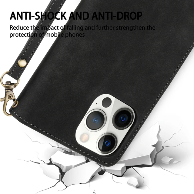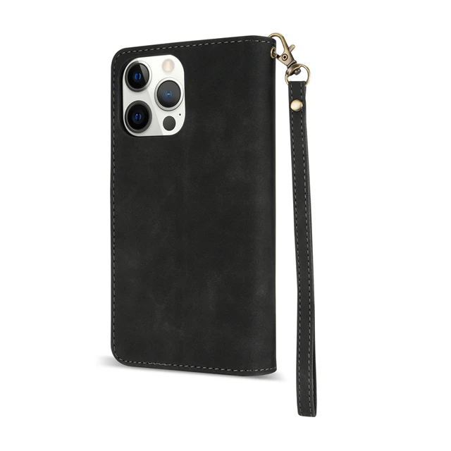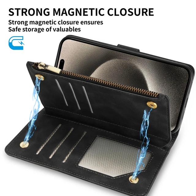 Portefeuille en cuir + rabat magnétique + support de support + fentes pour cartes + corde à main.