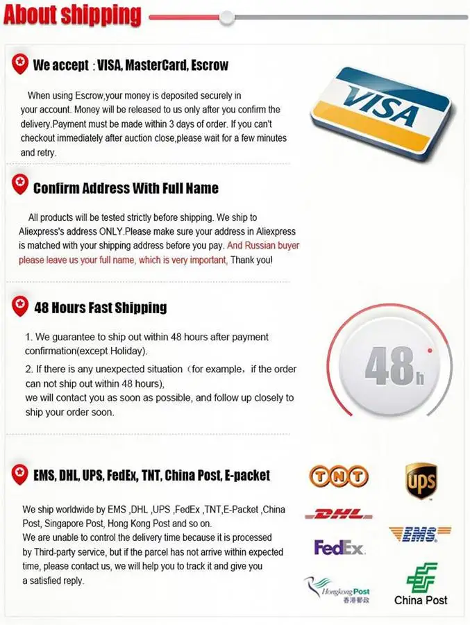 3. Toutes les commandes seront émises dans les 3 jours, en cas de situation inattendue, nous pouvons retarder le délai d’expédition.