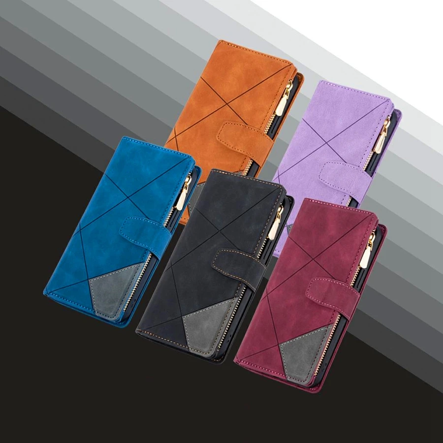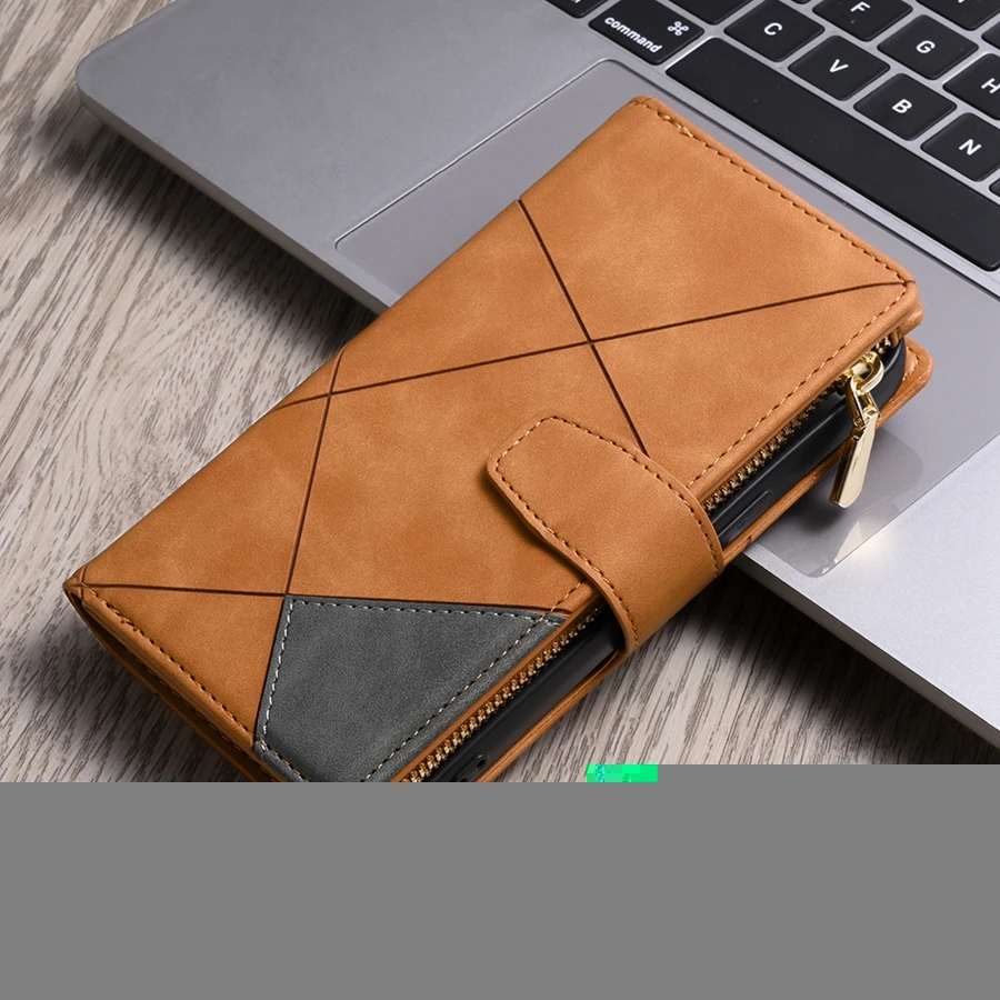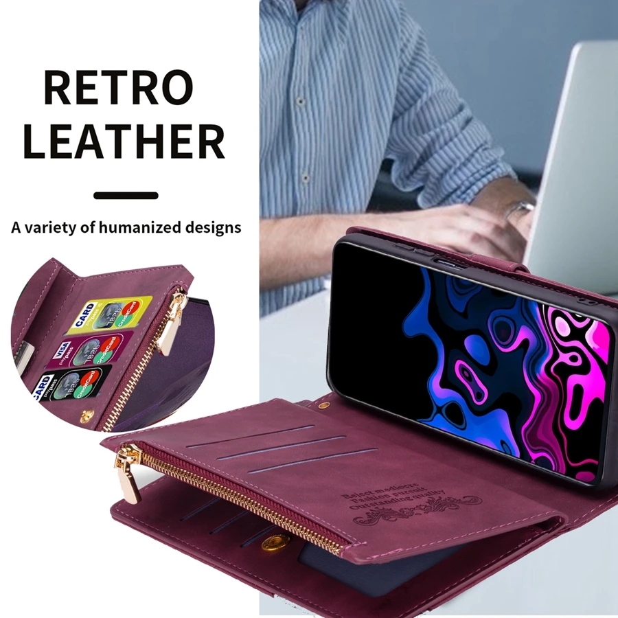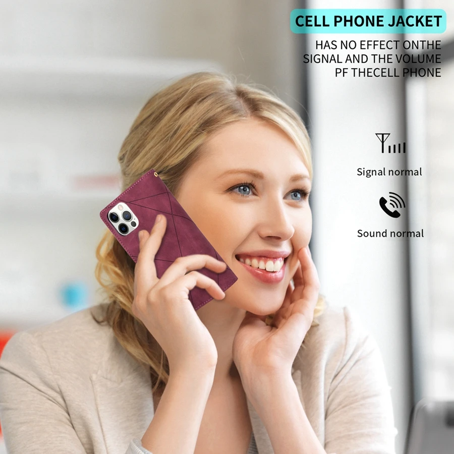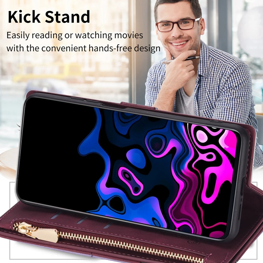 Portefeuille en cuir + rabat magnétique + support de support + fentes pour cartes + dragonne.