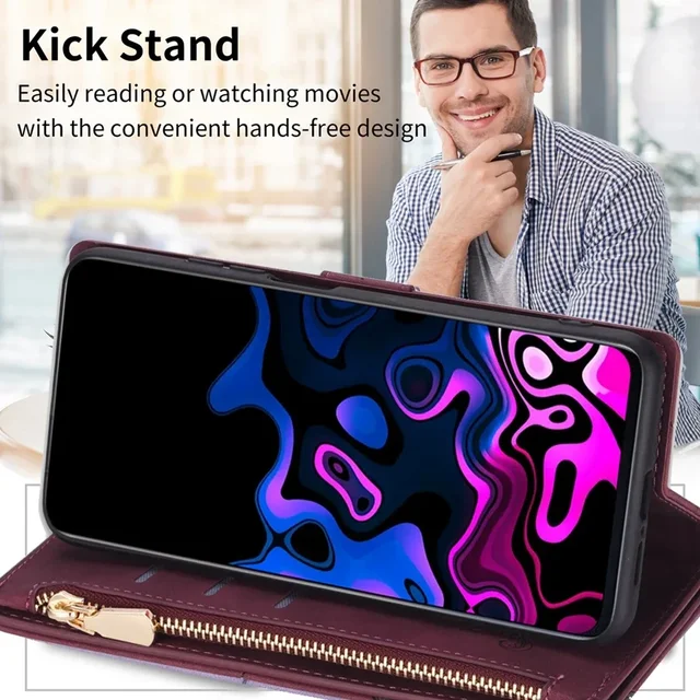Portefeuille en cuir + rabat magnétique + support de support + fentes pour cartes + dragonne.