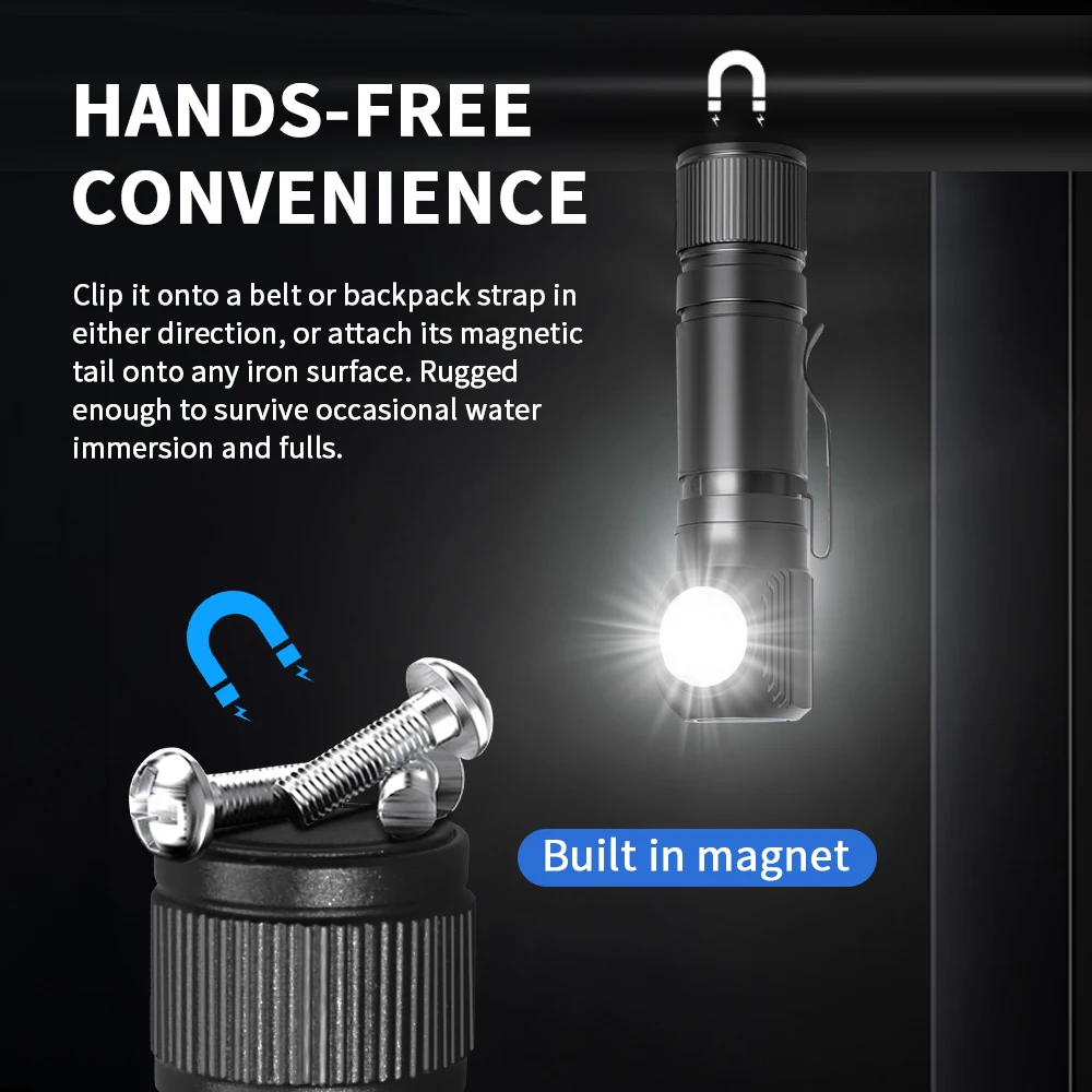 Natfire HS50 est une lampe de poche et une lampe à outils professionnelles à angle lumineux, conçues pour de multiples activités intérieures et extérieures comme le camping, la randonnée, la pêche ou la chasse. Avec le bandeau fourni, il peut également être utilisé comme lampe frontale. Il est alimenté par une seule batterie rechargeable lithium-ion 18650, rechargeable via USB-C (Batterie non incluseSi nécessaire, veuillez choisir la deuxième option “avec batterie 3400mAh”) De plus, le HS50 est livré avec une sangle élastique réglable, un capuchon magnétique et 4 clips de casque pour une utilisation flexible et pratique d’une seule main.