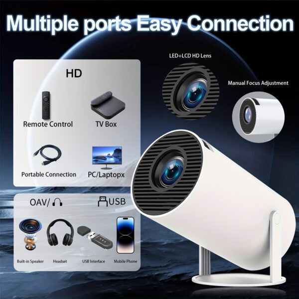 Compatibilité complète de l’interface + grand écran de 130″ : les interfaces HD, USB et audio sont disponibles pour une connexion directe aux ordinateurs, boîtiers TV, Xbox et autres appareils. La distance d’projection optimale de 1,68 mètres permet de projeter un écran de 130 pouces. Le support rotatif à 180° permet un réglage individuel des angles. Correction automatique du keystone qui redresse l’image en quelques secondes
