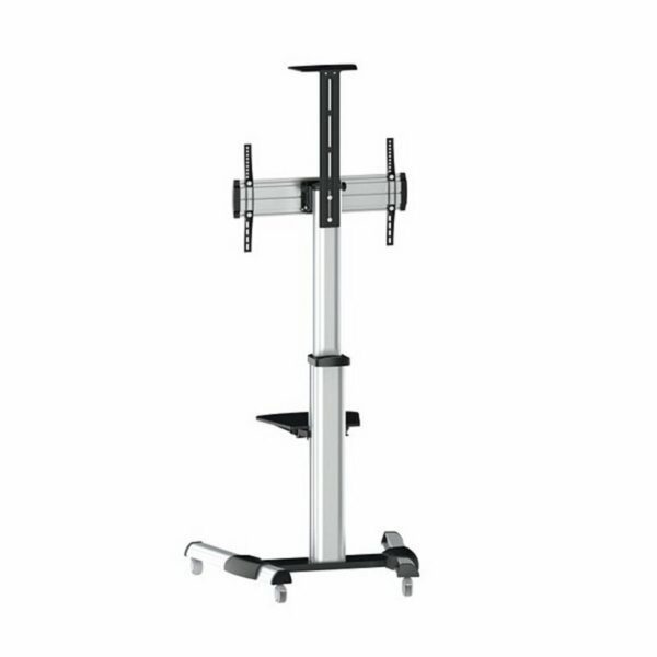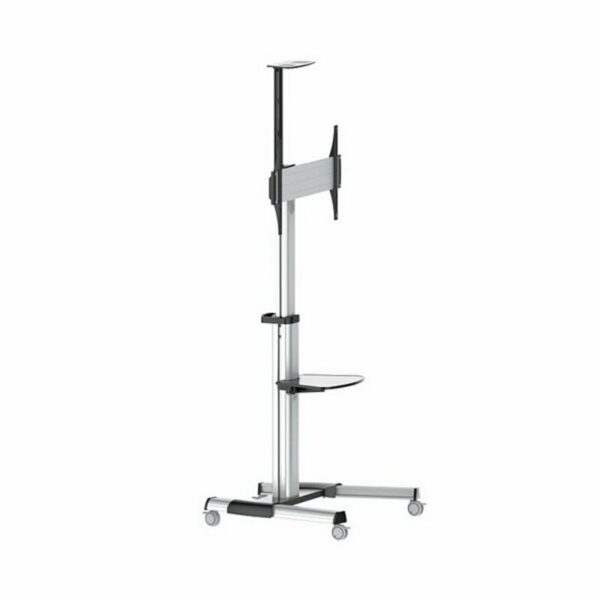 Le Support TV FS1870M-B de la marque TooQ est un support sur pied conçu pour des écrans de 37 à 70 pouces, fabriqué en aluminium avec une finition argentée alliant robustesse et légèreté, facilitant sa mobilité grâce à ses roulettes avec système de blocage. Ce support se distingue par sa grande capacité, compatible avec les standards VESA allant de 200×200 mm jusqu’à 600×400 mm, assurant un montage sûr pour la plupart des téléviseurs et écrans du marché. Il peut supporter un poids maximal d’écran de 50 kg, garantissant la stabilité pour les modèles de grande taille. De plus, son design permet une rotation de l’écran de 90º pour s’adapter à différents angles de vue, et dispose d’un angle d’inclinaison réglable entre +5° et -12°, offrant une orientation flexible. Le support intègre des plateaux réglables, un inférieur et un supérieur, destinés à accueillir lecteurs, DVD ou caméras, avec des dimensions spécifiques de 430×335 mm pour le plateau inférieur et 285×150 mm pour le supérieur, situé à une hauteur maximale de 2069 mm. Sa structure est réglable en hauteur, permettant des ajustements entre 1200 et 1600 mm pour s’adapter à différents environnements et besoins. Les dimensions entre les roues, 828×700 mm, assurent un bon support et une stabilité optimale. Il intègre un système de gestion des câbles qui aide à maintenir l’espace ordonné, évitant les enchevêtrements et facilitant la gestion des connexions. Son poids net est de 21 kg, et le montage est facilité grâce à un kit complet incluant tous les outils nécessaires, ainsi qu’un manuel d’installation. En résumé, le support TV FS1870M-B représente une solution robuste et polyvalente pour installer des écrans moyens et grands dans des espaces professionnels ou domestiques, alliant fonctionnalité, design pratique et finition durable.