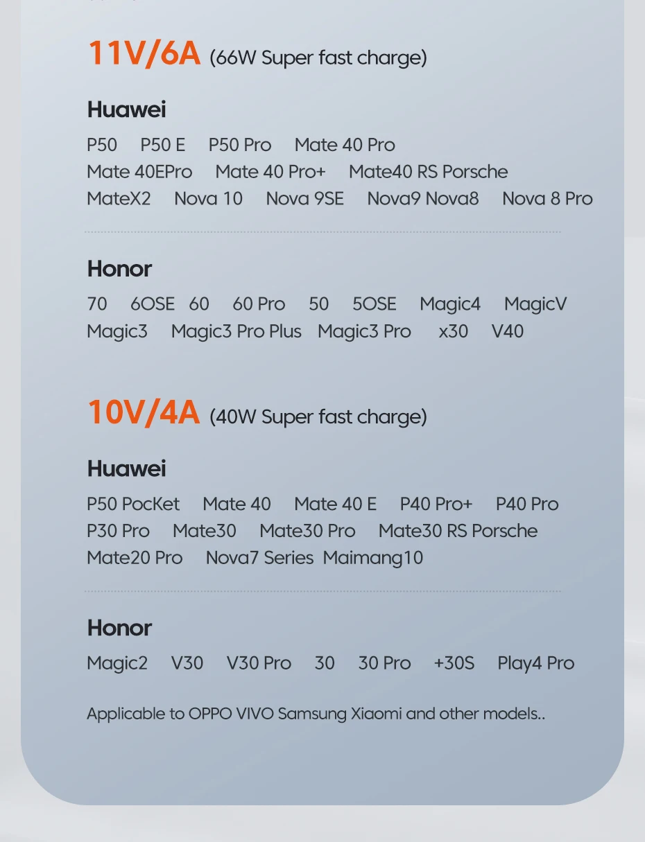 Le câble de données est compatible avec les systèmes de charge rapide Huawei (toutes séries) et est rétrocompatible avec les spécifications de charge rapide 11V/6A 10V/4A 4,5 V/5A.