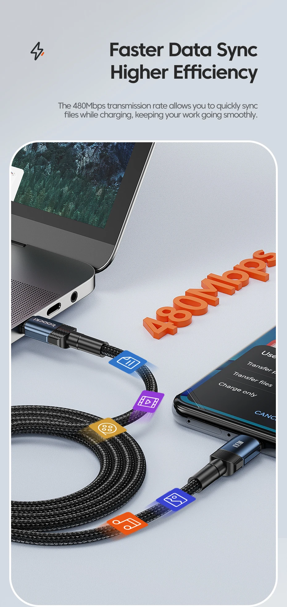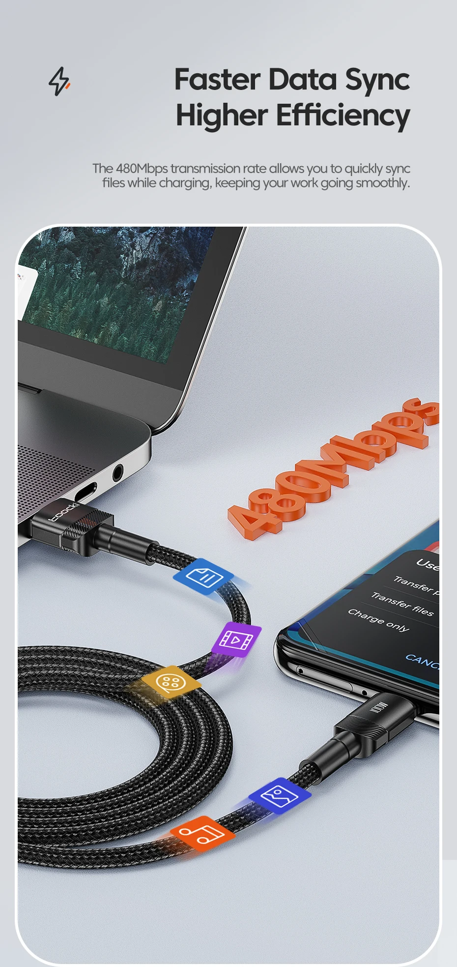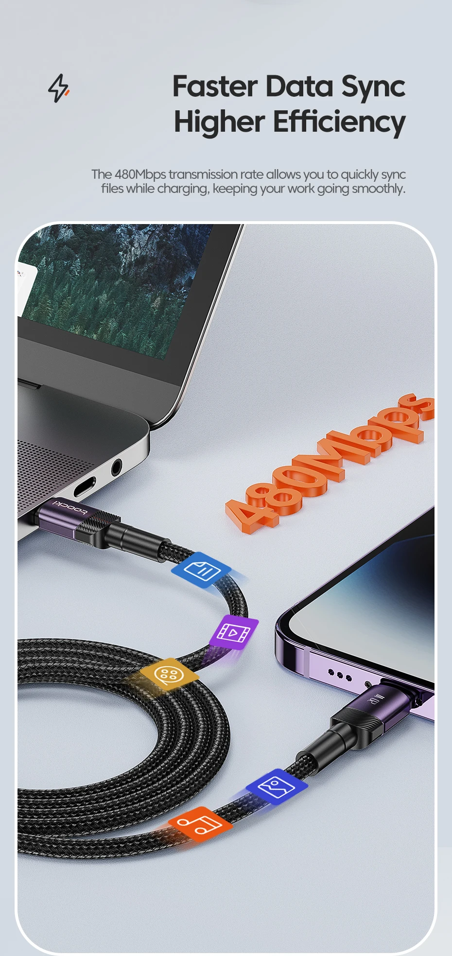 Le taux de transmission de 480Mbps vous permet de synchroniser rapidement les fichiers tout en chargeant, gardant votre travail en douceur.