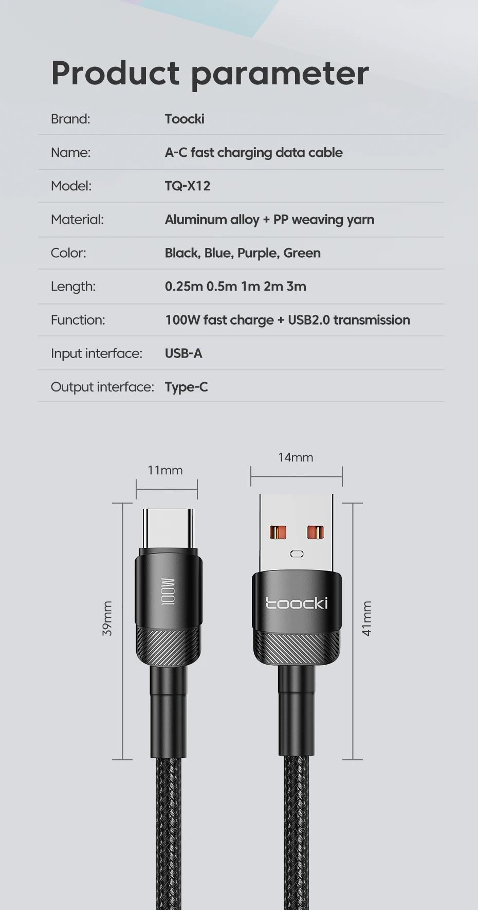 Couleur: noir, bleu, violet, vert Longueur: 0,25 m 0,5 m 1m 2m 3m Fonction: 100w charge rapide + transmission USB2.0