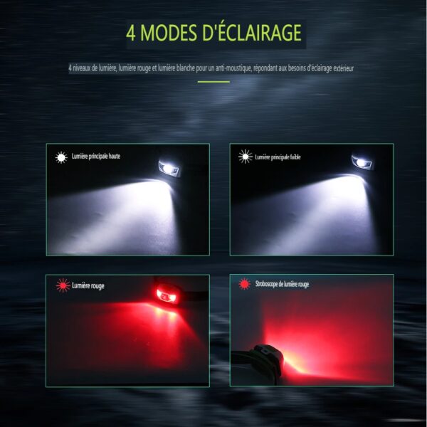 4 MODES D’ÉCLAIRAGE.: Haute luminosité-Faible luminosité-Lumière rouge-Strobe, Plus de mode sont disponibles.