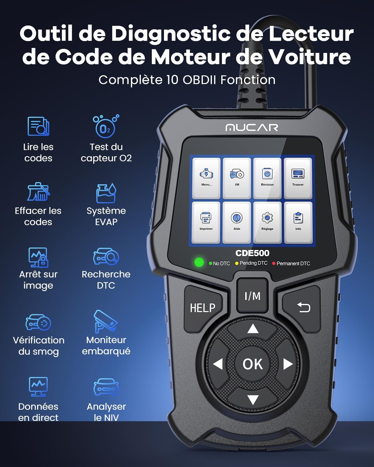 - 【Diagnostic Voiture OBDII /EOBD COMPLET – MODE 10】Ce diagnostic de voiture multimarque, il a toutes les fonctions d’obdii. Lire les codes, effacer les codes, voyant de défaut MIL, données en direct (2-IN-1), test du système EVAP, test du moniteur embarqué (module 6), vue geler l’image, test du capteur O2, identification du véhicule d’information, I/M Préparation, recherche DTC, pour tous les véhicules conformes OBD II.