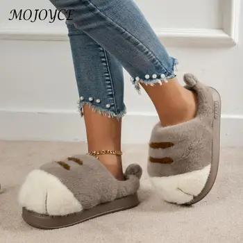 Pantoufles en peluche patte de chat 3D, pantoufles thermiques plates, pantoufles confortables pour la maison, pantoufles de couple patte de chat en fourrure pour chambre à coucher intérieure